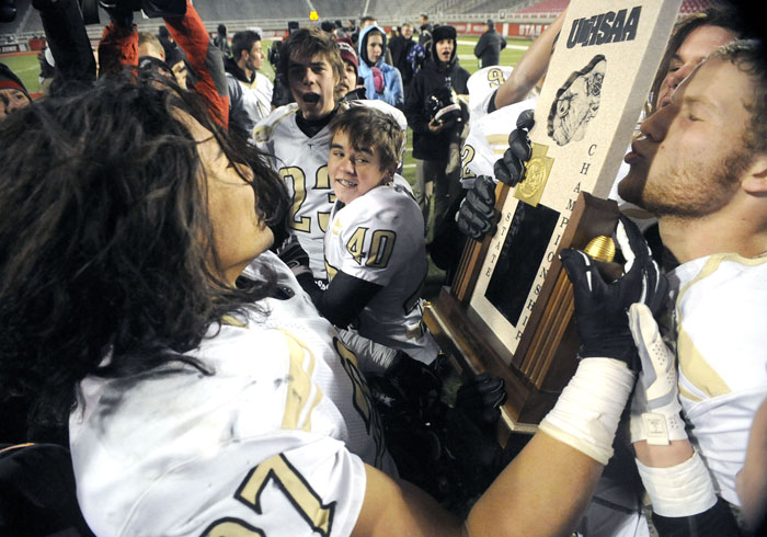 Desert Hills’ Braden Reber kisses the trophy after defeating Pine View for the 3AA State Championship at Rice-Eccles Stadium on Friday, November 22, 2013.