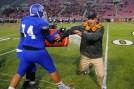 Bingham Head Coach Dave Peck dodges the water bucket as the Bingham Miners defeated the Brighton Bengals during the 5A State Championships at Rice Eccles Stadium on Friday, November 22, 2013.