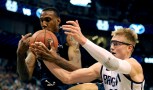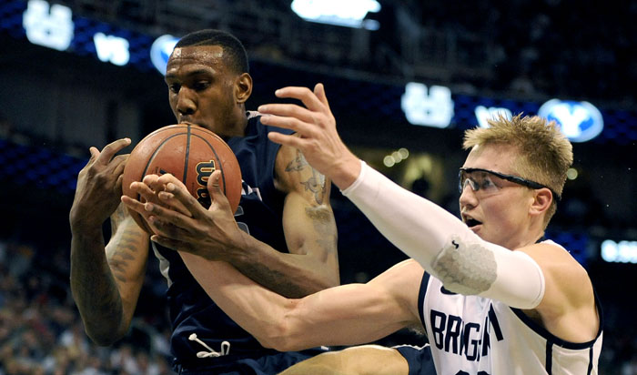 Utah State Aggies center Jarred Shaw (5) and Brigham Young Cougars forward Eric Mika (00) fight for a rebound during a game at EnergySolutions Arena on Saturday, November 30, 2013.
