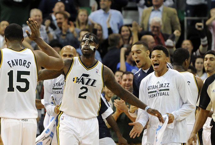 Utah Jazz power forward Marvin Williams (2) celebrates a 3-point basket during a time out late in the fourth quarter during a game at EnergySolutions Arena on Monday, December 2, 2013.