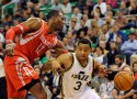 Utah Jazz point guard Trey Burke (3) drives around the defense of Houston Rockets power forward Dwight Howard (12) during a game at EnergySolutions Arena on Monday, December 2, 2013.