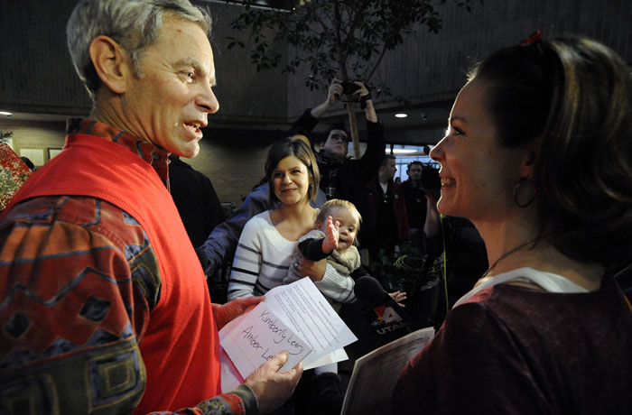 So a federal judge overturned Utah’s Amendment 3 outlawing same-sex marriages, so as soon as that happened couple flocked to the county building for licenses. http://www.deseretnews.com/article/865592831/Same-sex-couples-flock-to-SL-County-offices-in-wake-of-Amendment-3-decision.html