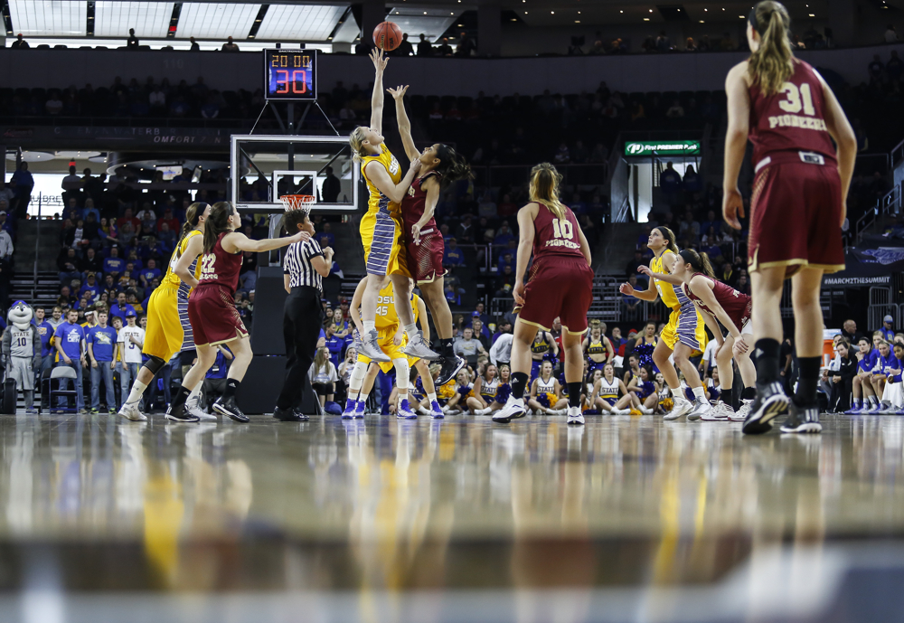 The South Dakota State Jackrabbits and Denver Pioneer Women tip off during a first round game in the Summit League Tournament at the Sanford Premier Center in Sioux Falls. (Matt Gade/Republic)