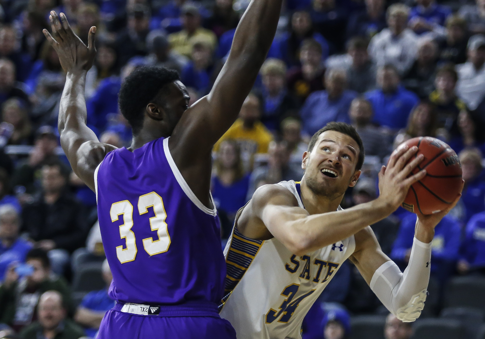 South Dakota State Jackrabbits forward Cody Larson (34)goes to the basket around the defense of Western Illinois Leathernecks forward Jalen Chapman (33) during a first round game in the Summit League Tournament at the Sanford Premier Center in Sioux Falls. (Matt Gade/Republic)