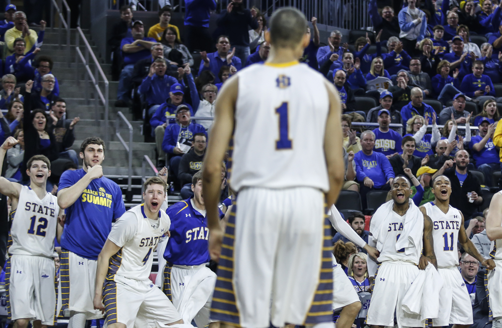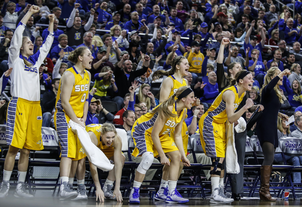 The bench reacts after a dunk by South Dakota State Jackrabbits guard Skyler Flatten (1) during a first round game in the Summit League Tournament at the Sanford Premier Center in Sioux Falls. (Matt Gade/Republic)