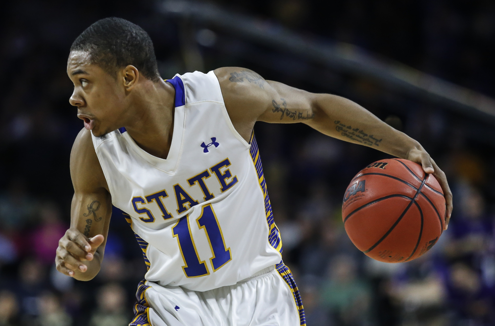 South Dakota State Jackrabbits guard George Marshall (11) brings the ball up the court during a first round game in the Summit League Tournament at the Sanford Premier Center in Sioux Falls. (Matt Gade/Republic)