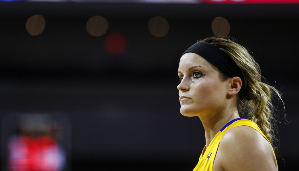 Sweat drips down South Dakota State Jackrabbits guard/forward Kerri Young (10) face while waiting for a media timeout to end during a first round game in the Summit League Tournament at the Sanford Premier Center in Sioux Falls. (Matt Gade/Republic)