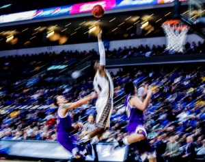 South Dakota State Jackrabbits guard Deondre Parks (0) races to the basket for shot over a pair of Western Illinois Leatherneck defenders during a first round game in the Summit League Tournament at the Sanford Premier Center in Sioux Falls. (Matt Gade/Republic)