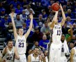 South Dakota State Jackrabbits guard Cory Jacobsen (13) puts up a 3-point basket in front of the SDSU bench during a first round game in the Summit League Tournament at the Sanford Premier Center in Sioux Falls. (Matt Gade/Republic)