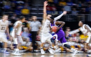 Western Illinois Leathernecks forward Mohammed Conde (34) tries to make his way to the basket while being defended by South Dakota State Jackrabbits guard Reed Tellinghuisen (23), South Dakota State Jackrabbits guard George Marshall (11), South Dakota State Jackrabbits forward Cody Larson (34) and South Dakota State Jackrabbits guard Deondre Parks (0) during a first round game in the Summit League Tournament at the Sanford Premier Center in Sioux Falls. (Matt Gade/Republic)