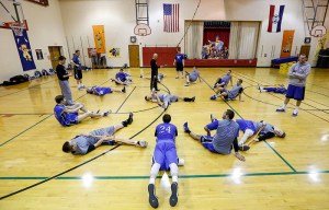 Dakota Wesleyan Head Coach Matt Wilber jokes around with his players as they stretch following practice on Wednesday afternoon at Branson Cedar Ridge Elementary School in Branson, Mo. Dakota Wesleyan will face Milligan (Tenn.) in the first round of the NAIA Division II National Championship Tournament at Keeter Gymnasium on the campus of College of the Ozarks in Point Lookout, Mo. (Matt Gade/Republic)