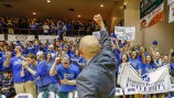 Dakota Wesleyan Head Coach Matt Wilber gives a fist pump to the crowd after their win against the College of Idaho on Saturday during the third round of the NAIA Division II National Championship Tournament in the Keeter Gymnasium on the campus of the College of the Ozarks in Point Lookout, Mo. (Matt Gade/Republic)