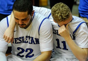 Dakota Wesleyan’s Joey Mitchell (22) and Dakota Wesleyan’s Tate Martin (11) take a moment in the closing minutes of the Tigers game as they lost 66-45 to the Cornerstone University Golden Eagles on Tuesday in the NAIA Division II National Championship game in the Keeter Gymnasium on the campus of the College of the Ozarks in Point Lookout, Mo. (Matt Gade/Republic)