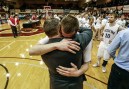 Dakota Wesleyan’s Luke Bamberg (2) hugs assistant coach Jacob Brandl following the Tigers 66-45 loss to the Cornerstone University Golden Eagles on Tuesday in the NAIA Division II National Championship game in the Keeter Gymnasium on the campus of the College of the Ozarks in Point Lookout, Mo. (Matt Gade/Republic)