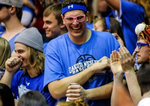 Mitch Heisinger, left, Spencer Bloch, center, and Jared Van Winkle cheer on the Dakota Wesleyan men’s basketball team during the first round of the NAIA Division II National Tournament at the Keeter Gymnasium on the campus of College of the Ozarks in Point Lookout, Mo. (Matt Gade/Republic)