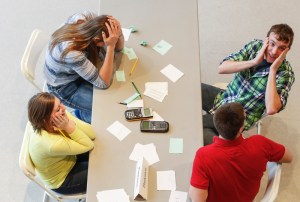 Plankinton students (clockwise from left) Kallyn Prangley, Megan Bultsma, Justin Krell and Tye Harris react after missing a question as the competed in the quiz bowl as part of the 20th annual Custer Battlefield Highway Academic Festival on Wednesday in the Sherman Center at Dakota Wesleyan University in Mitchell. (Matt Gade/Republic)