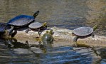 A group of turtles rest atop a log as another one joins them out of the water on Tuesday afternoon in Lake Mitchell. (Matt Gade/Republic)