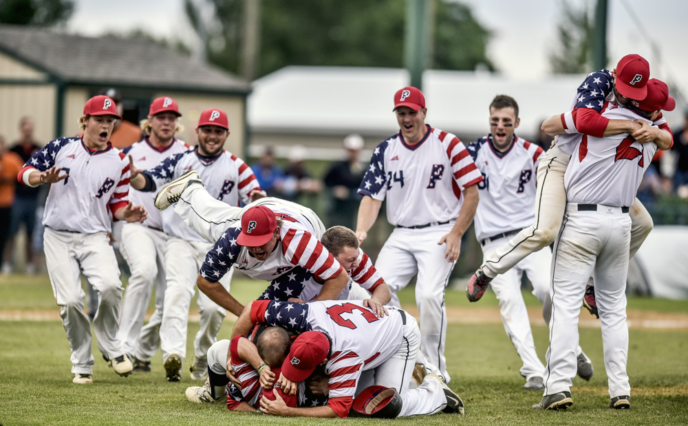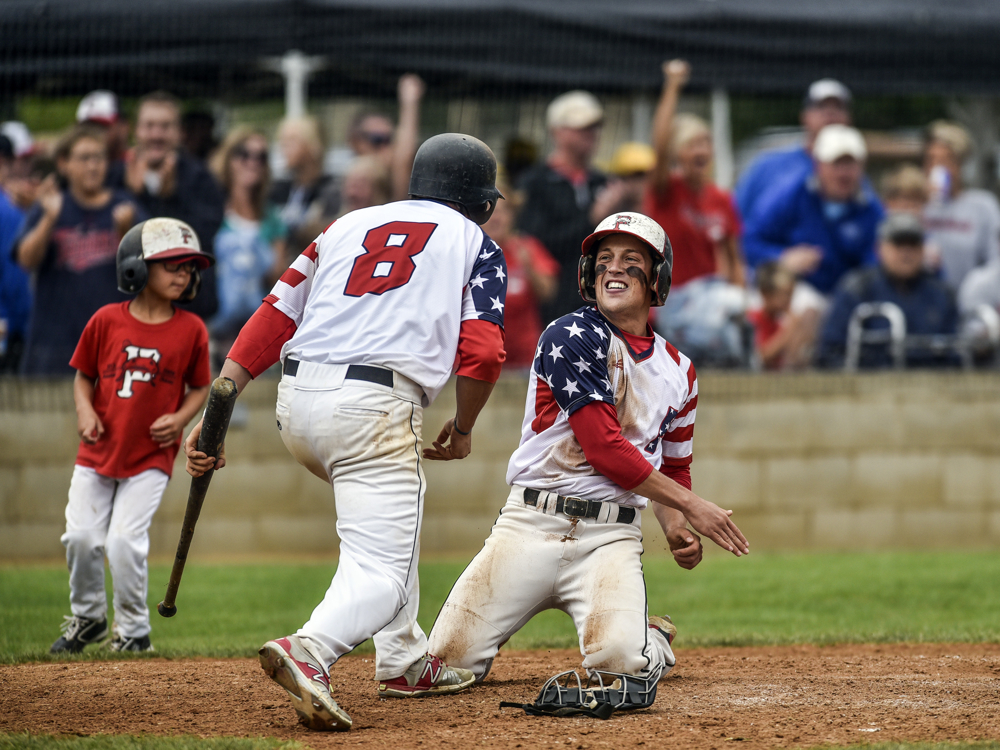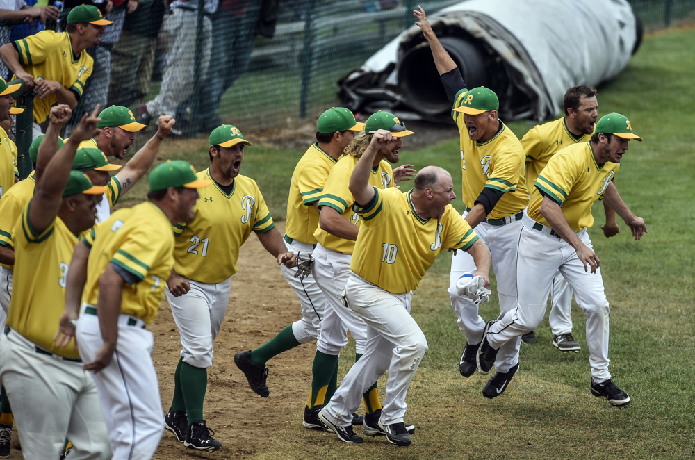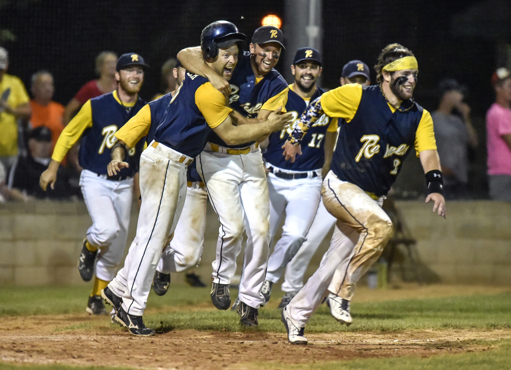The Akron Rebels celebrate their 7-6 win over Canova/Howard in 16 innings during the state amateur baseball tournament on Thursday at Cadwell Park. (Matt Gade/Republic)