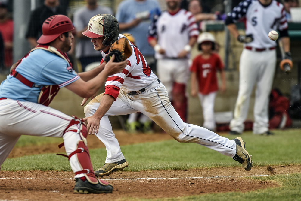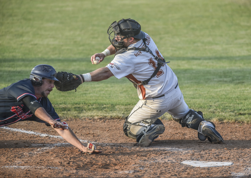 Milbank’s Dan Karges beats the tag by Lennox’s Jeremy VanHeel at home plate in the state amateur baseball championships on Wednesday at Cadwell Park. (Matt Gade/Republic)