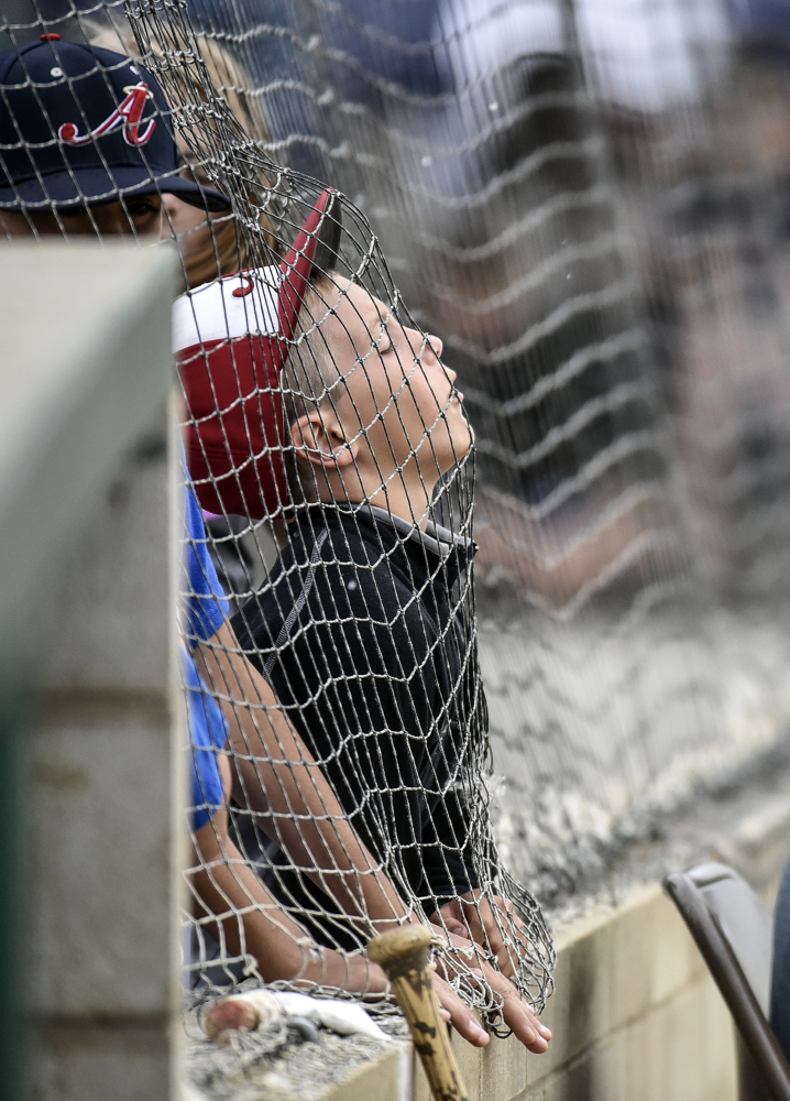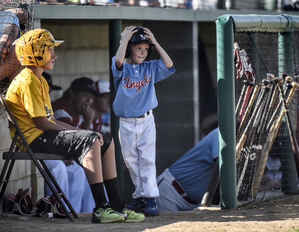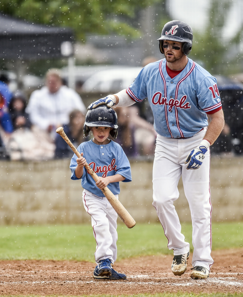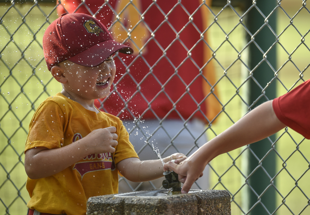 Cooper Koepsell (3) of Canova gets splashed in the face with water while him and other kids play around during the Canova/Howard-Akron (Ia.) game during the state amateur tournament on Thursday evening at Cadwell Park in Mitchell. (Matt Gade/Republic)