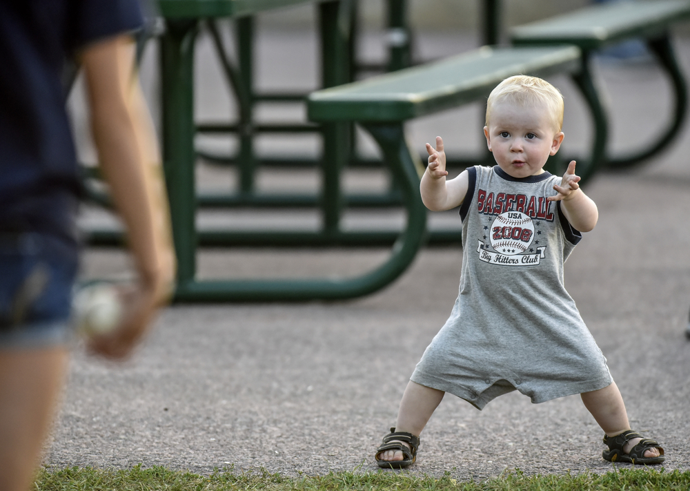 18-month-old Micah Krause waits for the ball while playing catch near the picnic tables during the Lennox vs. Millbank game on Wednesday during the State Amateur tournament at Cadwell Park. (Matt Gade/Republic)