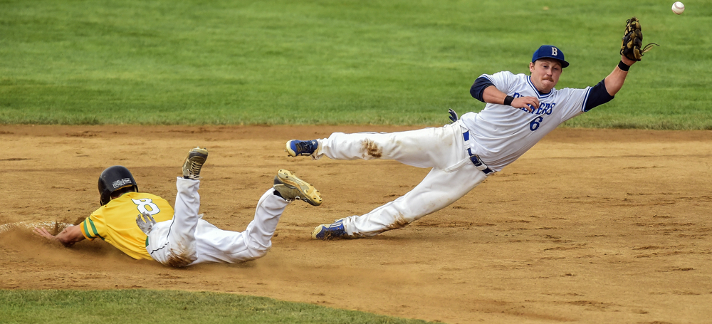 Renner’s (8) beats the throw to second base as Sioux Falls Brewers (6) is unable to make the grab during the Class A state amateur championship on Sunday at Cadwell Park in Mitchell. Also involved in the play is Sioux Falls Brewers’ (2). (Matt Gade/Republic)