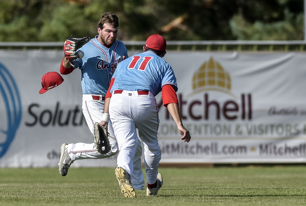 Alexandria’s Reid Smith (2) fields a hit into left field as Alexandria’s Jordan Gau (11) is also involved in the play during a game against the Freeman Black Sox in the state amateur baseball championships on Thursday at Cadwell Park. (Matt Gade/Republic)