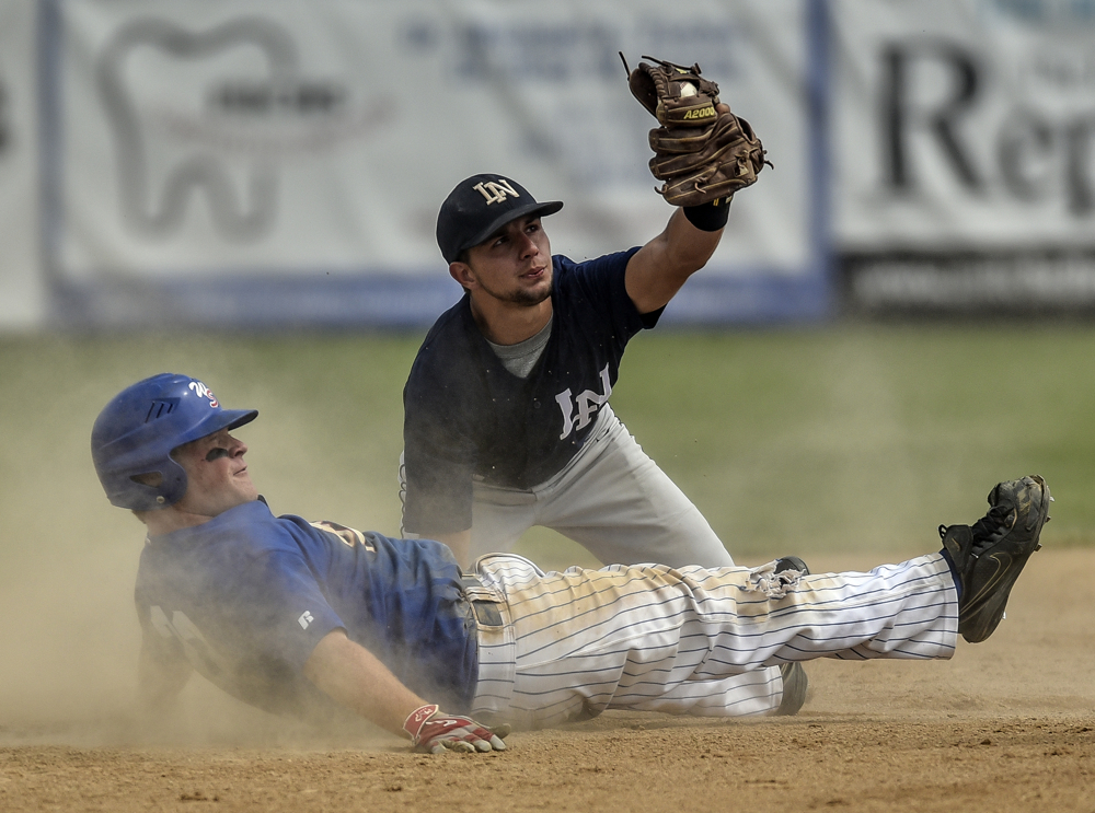 Action between the Wessington Springs Owls and the Lake Norden Lakers during a game in the state amateur baseball championships on Friday at Cadwell Park. (Matt Gade/Republic)