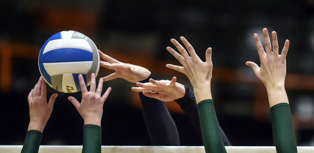 Sanborn Central/Woonsocket’s Myah Selland, center, blocks a shot at the net during a match against Harding County during the Class B state tournament on Friday at the Huron Arena.