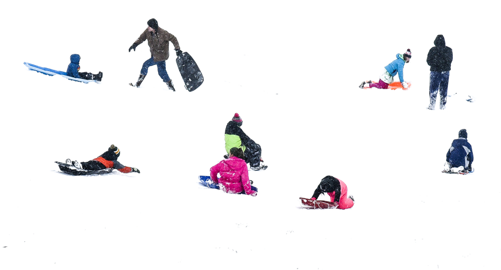 Adults and kids take advantage of snow day to go sledding at the amphitheater near Lake Mitchell on Wednesday afternoon.