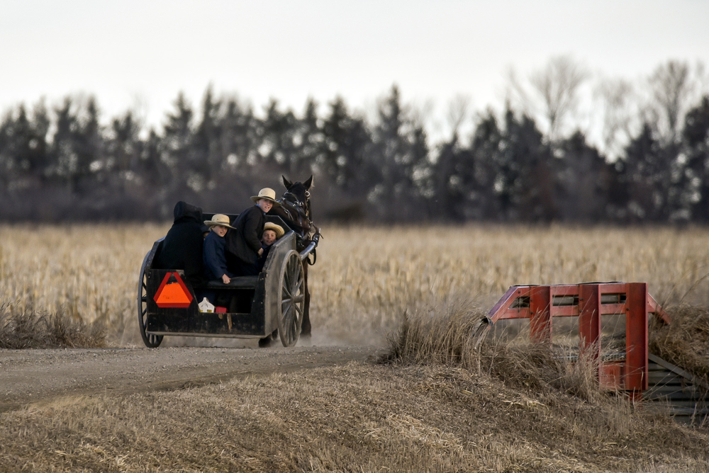 A group of Amish children race down 412th Avenue in a horse drawn carriage on Wednesday morning, a mile east of Tripp.