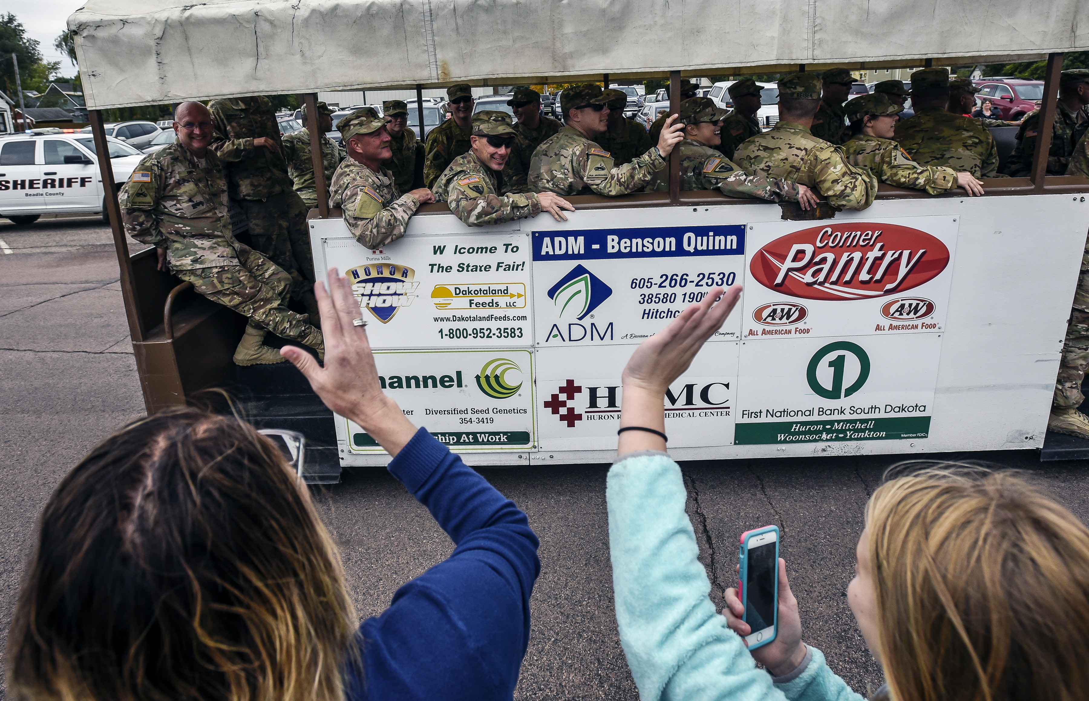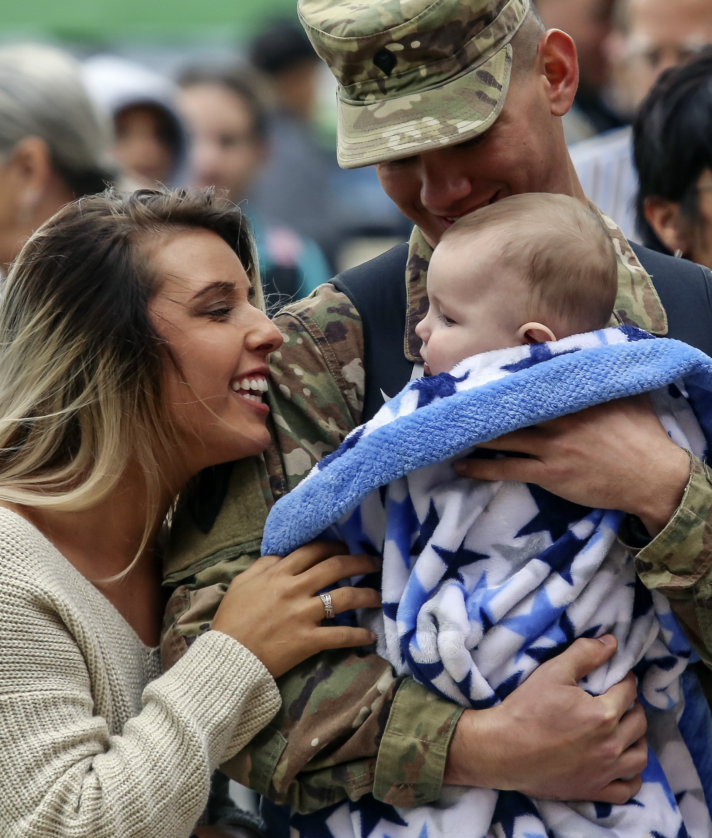 Coleen Smith, of Letcher, hugs her boyfriend Sgt. First Class Michael Hoffman after arriving at the Huron Arena for the 153rd Engineer Battalion’s Deactivation Ceremony on Saturday morning in Huron. (Matt Gade / Republic)