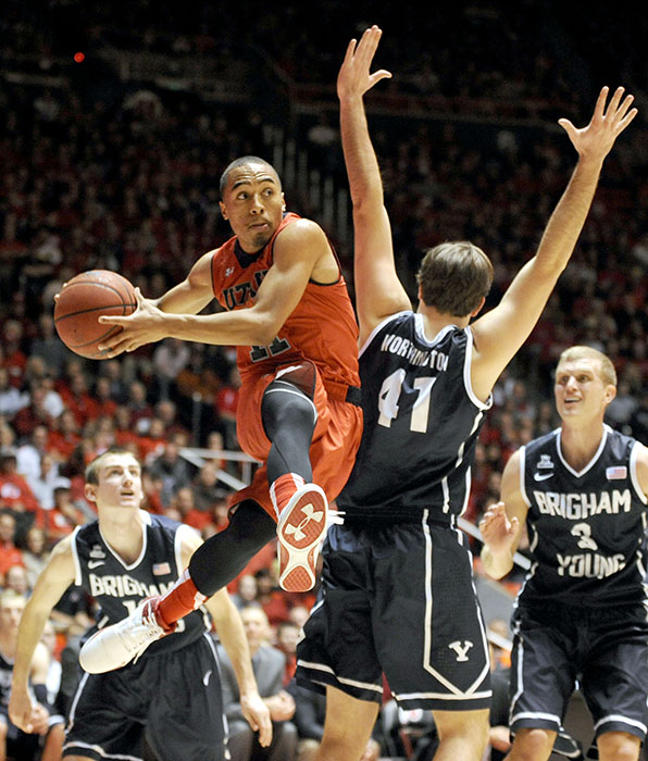 Utah Utes guard Brandon Taylor (11) passes the ball around Brigham Young Cougars forward Luke Worthington (41) during a game at the Jon M. Huntsman Center on Saturday, December 14, 2013.